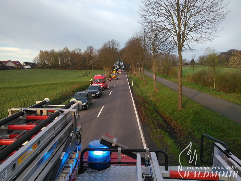 | Bericht: | Bei einem schweren Verkehrsunfall ohne Fremdbeteiligung auf der B 423 zwischen Waldmohr und Schönenberg-Kübelberg wurden gegen 7 Uhr drei Personen zum Teil schwerstverletzt. Das aus Richtung Waldmohr kommende Fahrzeug kam mehrfach von der Straße ab, überschlug sich und kollidierte auf der Gegenseite mit einem Baum, bevor es in Seitenlage liegenblieb. Während sich Fahrer und Beifahrer beim Eintreffen der Feuerwehr bereits außerhalb des Fahrzeuges befanden, war ein dritter Insasse im Fahrzeug eingeklemmt. Nach der Stabilisierung des Fahrzeuges und der Abtrennung des Fahrzeugdaches wurde die Verletzte patientengerecht von Feuerwehr und Rettungsdienst aus dem Fahrzeug gerettet. Im Einsatz waren Rettungsmittel aus Schönenberg-Kübelberg und Homburg sowie ein Krankenwagen und der Notarzt aus Landstuhl, der Rettungshubschrauber Christoph 16 aus Saarbrücken, die Feuerwehr Waldmohr mit der Wehrleitung Oberes Glantal. Auch der Verbandsbürgermeister informierte sich an der Einsatzstelle über das Ausmaß des Ereignisses. |