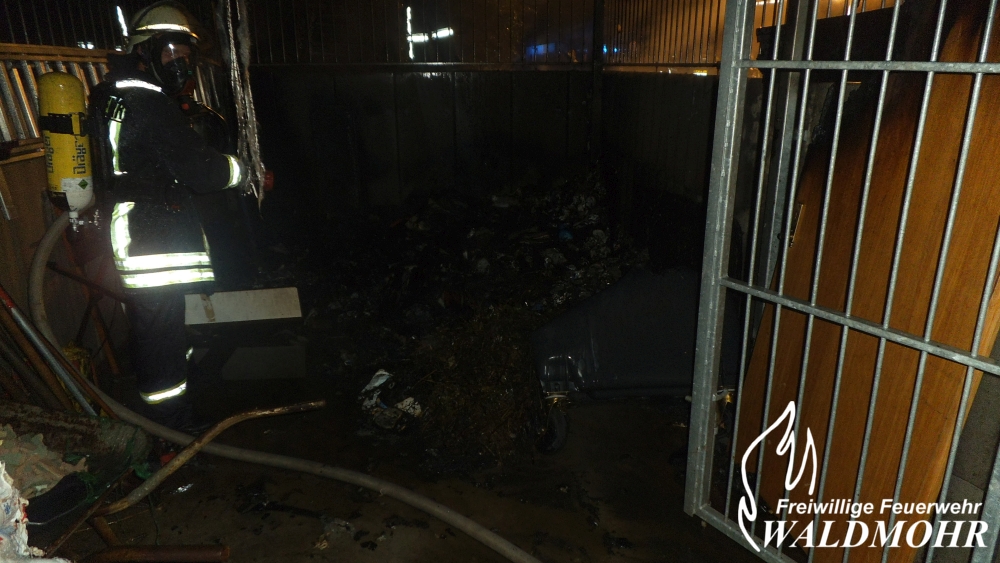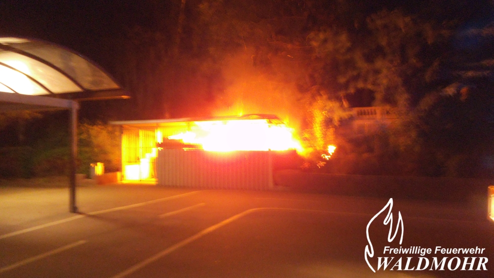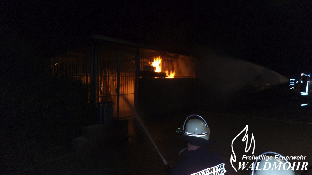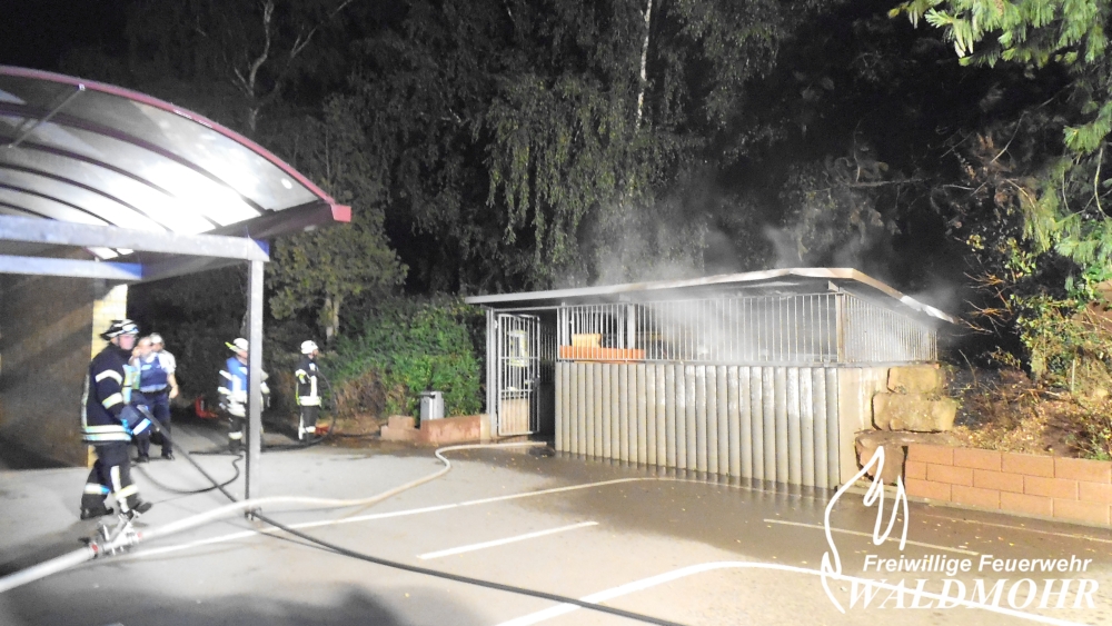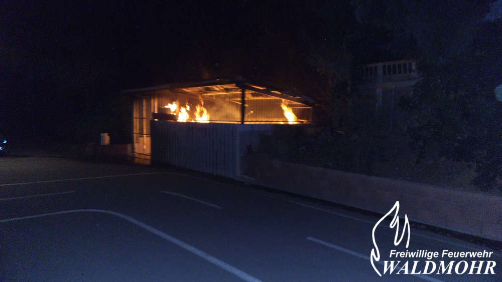 | Bericht: | Die ILS alarmierte die Feuerwehr Waldmohr unter dem Stichwort „Dachstuhlbrand“ zur Rothenfeldschule. Vor Ort entpuppte sich dieser als Brand eines Unterstandes für Müllcontainer und diverse Werkzeuge. Die Feuerwehr löschte zunächst aus sicherer Entfernung, da bei der Erkundung eine Gasflasche im Unterstand entdeckt worden war. Nachdem diese erfolgreich gekühlt worden war, konnte ein Trupp unter Atemschutz den Unterstand begehen und das Feuer zügig unter Kontrolle bringen und schließlich ablöschen. |
